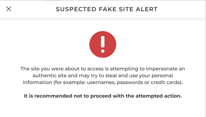 Alerts users at the moment they arrive at a cloned or copied website trying to impersonate a major trust brand before they enter their sensitive information, such as passwords, codes, credit card information, and more.